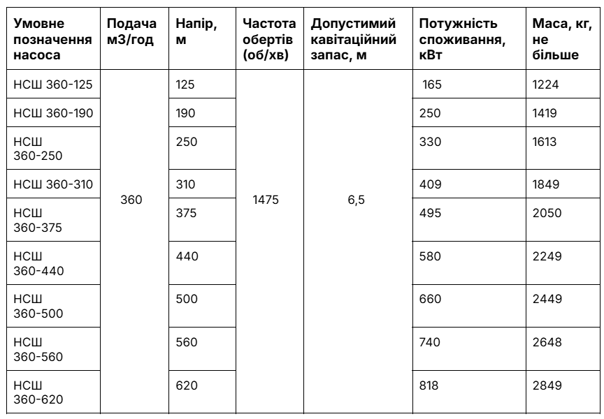 Насоси НСШ 360-125…620 призначені для перекачування води, що має водневий показник рН 7-8,5, з масовою часткою механічних домішок не більше 0,2% і розміром твердих частинок не більше 0,2 мм, мікротвердістю не більше 1,47 ГПа та щільністю не більше 1500 кг/м3, з температурою до 45°С.