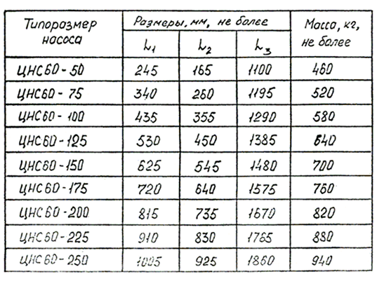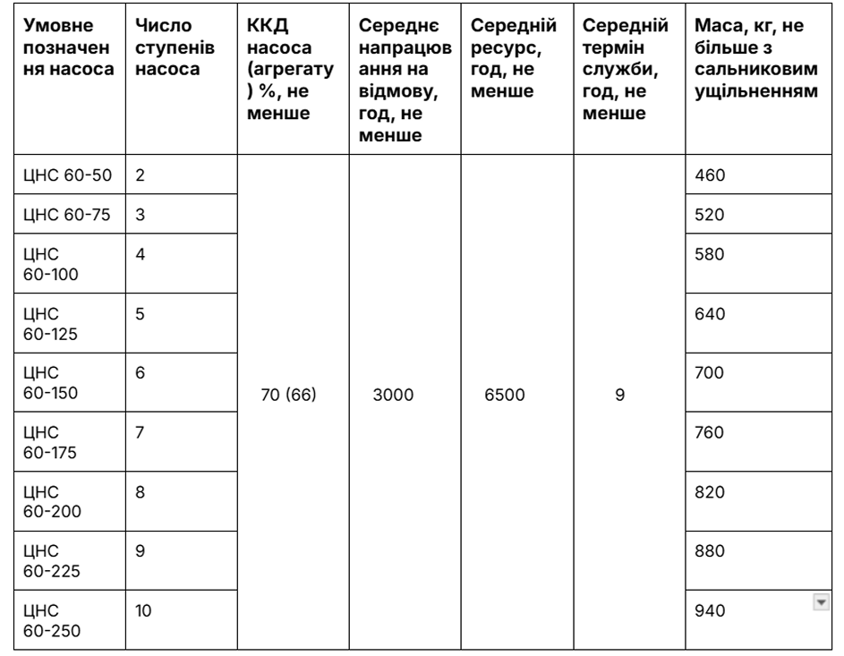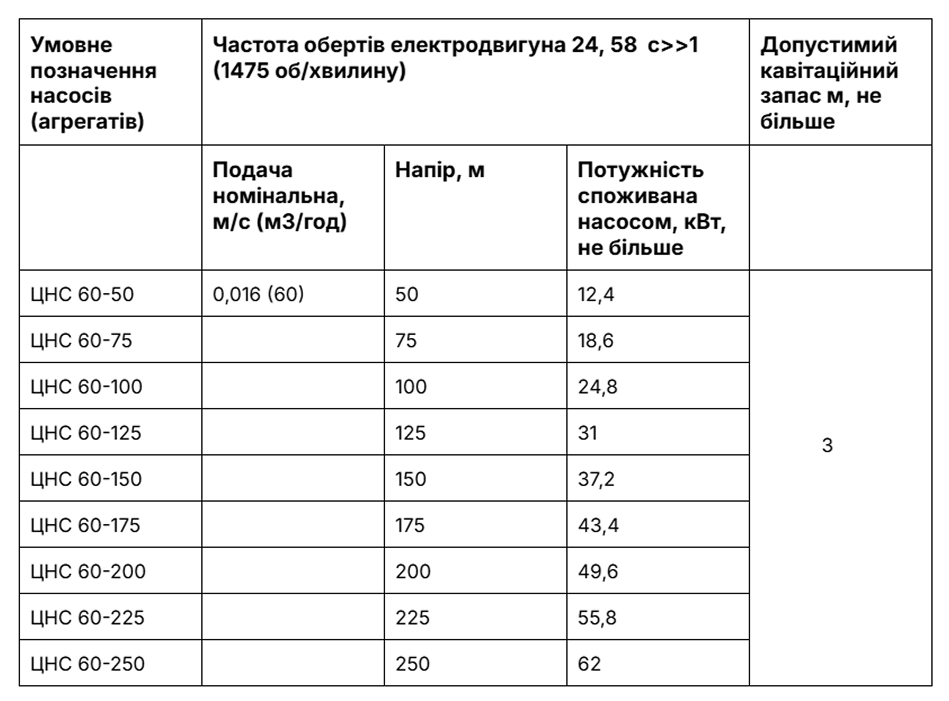 Основні технічні характеристики насоса ЦНС 60-50…250